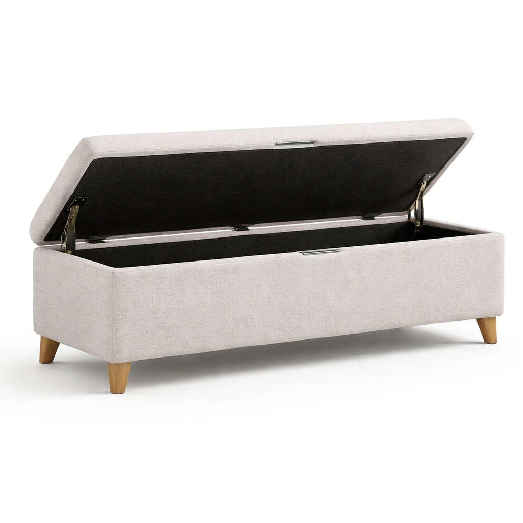 Banco con almacenamiento tapizado en tela beige con patas de madera 120x40x45 cm