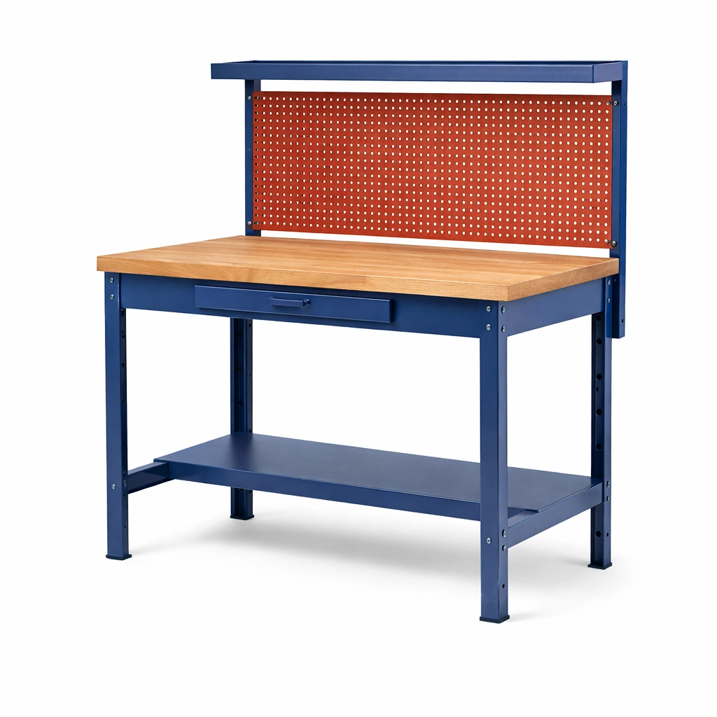 Incluye un panel perforado de acero naranja, un estante inferior y un cajón de almacenamiento. Esta mesa no es ajustable.